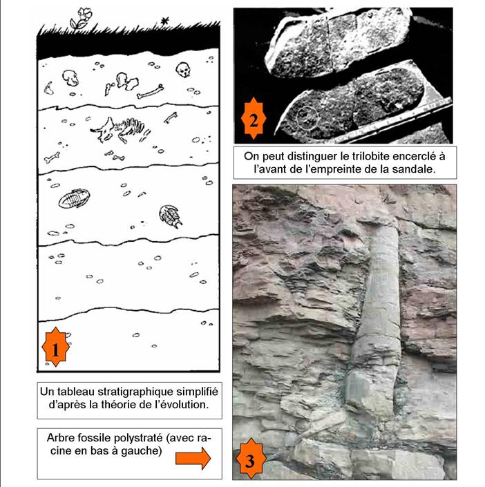 Certains fossiles, qu’on appelle fossiles traceurs ou fossiles de référence, sont liés à des couches de roches sédimentaires qu’on a officiellement assignées à chacune des trois périodes les plus récentes (les autres n’ont pas de fossiles désignés). Chacune de ces trois ères les plus récentes (le Cénozoïque, le Mésozoïque et le Paléozoïque) est divisée à son tour en périodes (12 selon certains auteurs), et chacune de ces périodes s’est vu attribuer un âge fixé en fonction des fossiles de référence qu’elle contient. Selon ce système de classification, les fossiles des organismes les plus simples se trouvent dans les couches rocheuses inférieures (donc les plus anciennes), et les organismes les plus complexes dans les couches supérieures (donc les plus récentes). Les spécimens de roches sont datés en fonction des fossiles traceurs ou de référence qui s’y trouvent. [illustration 1 : Un tableau stratigraphique simplifié d’après la théorie de l’évolution.]